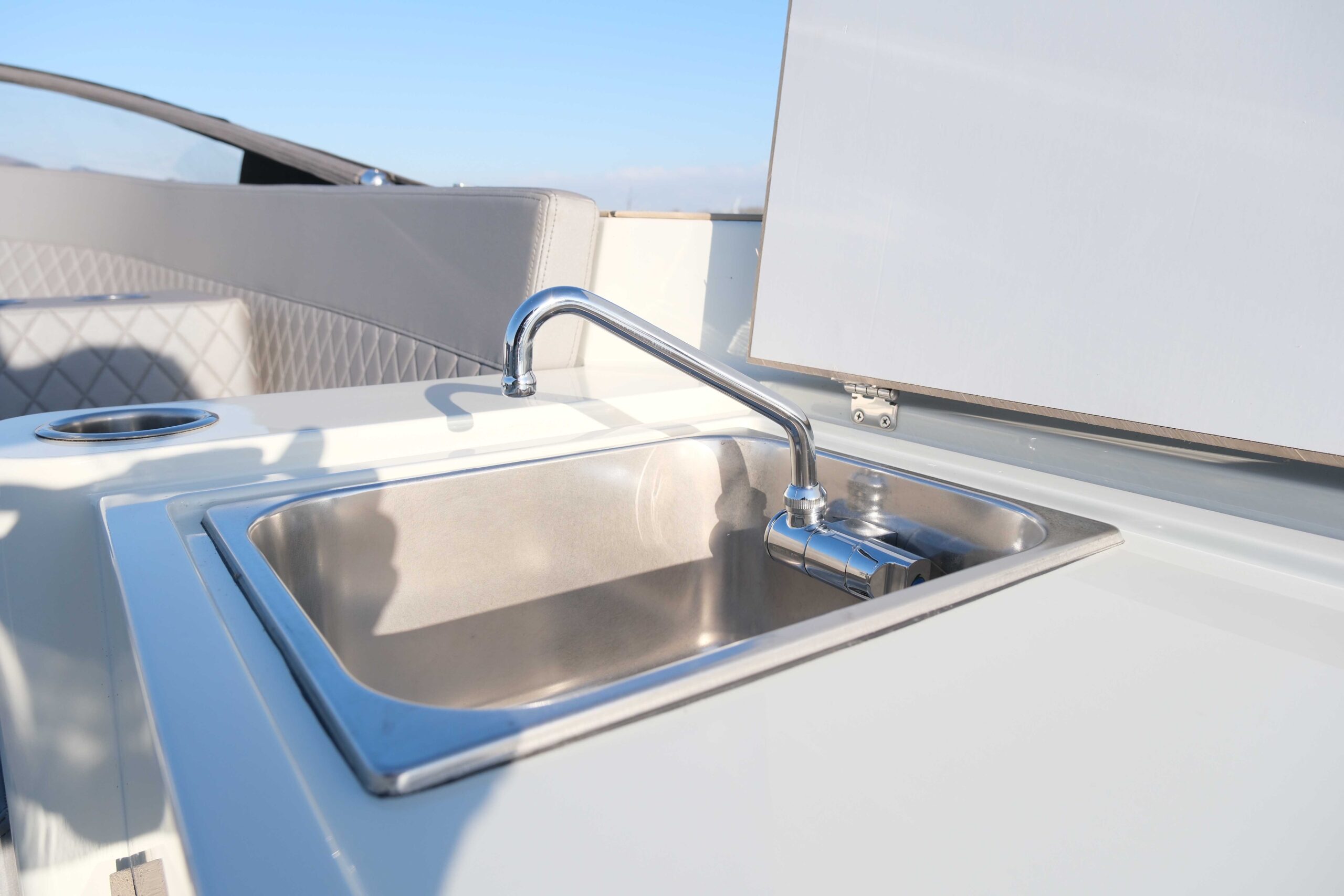 - Stainless steel sink with faucet amidships