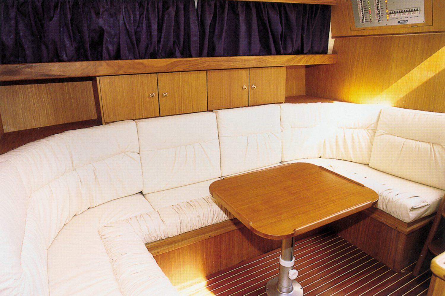 Zithoek met tafel in kajuit (tevens 2 pers. bed)