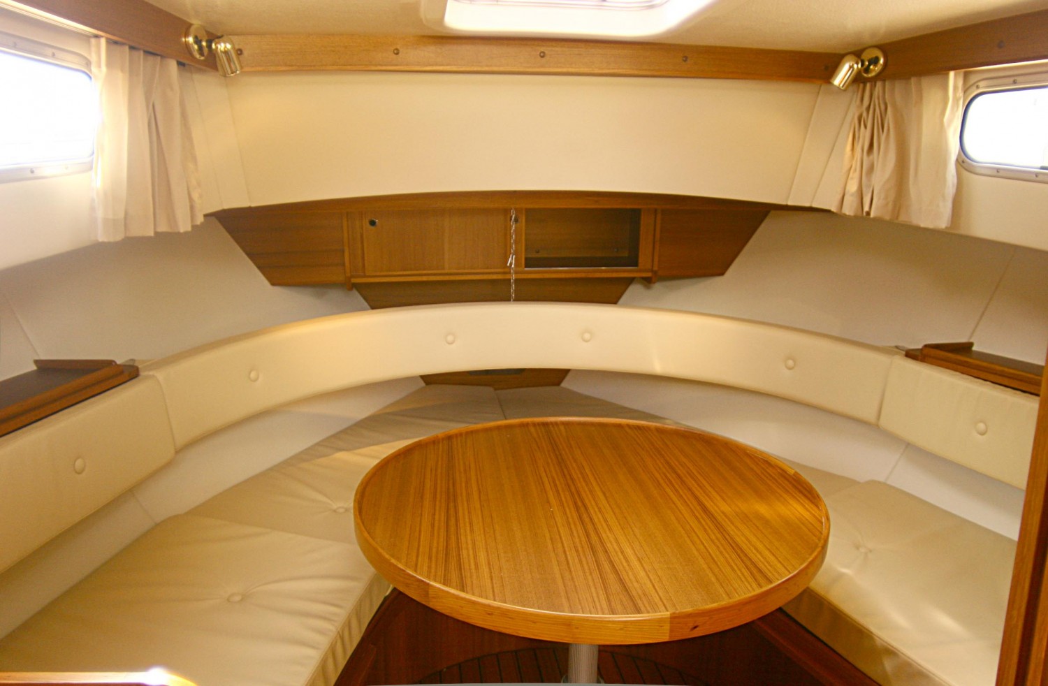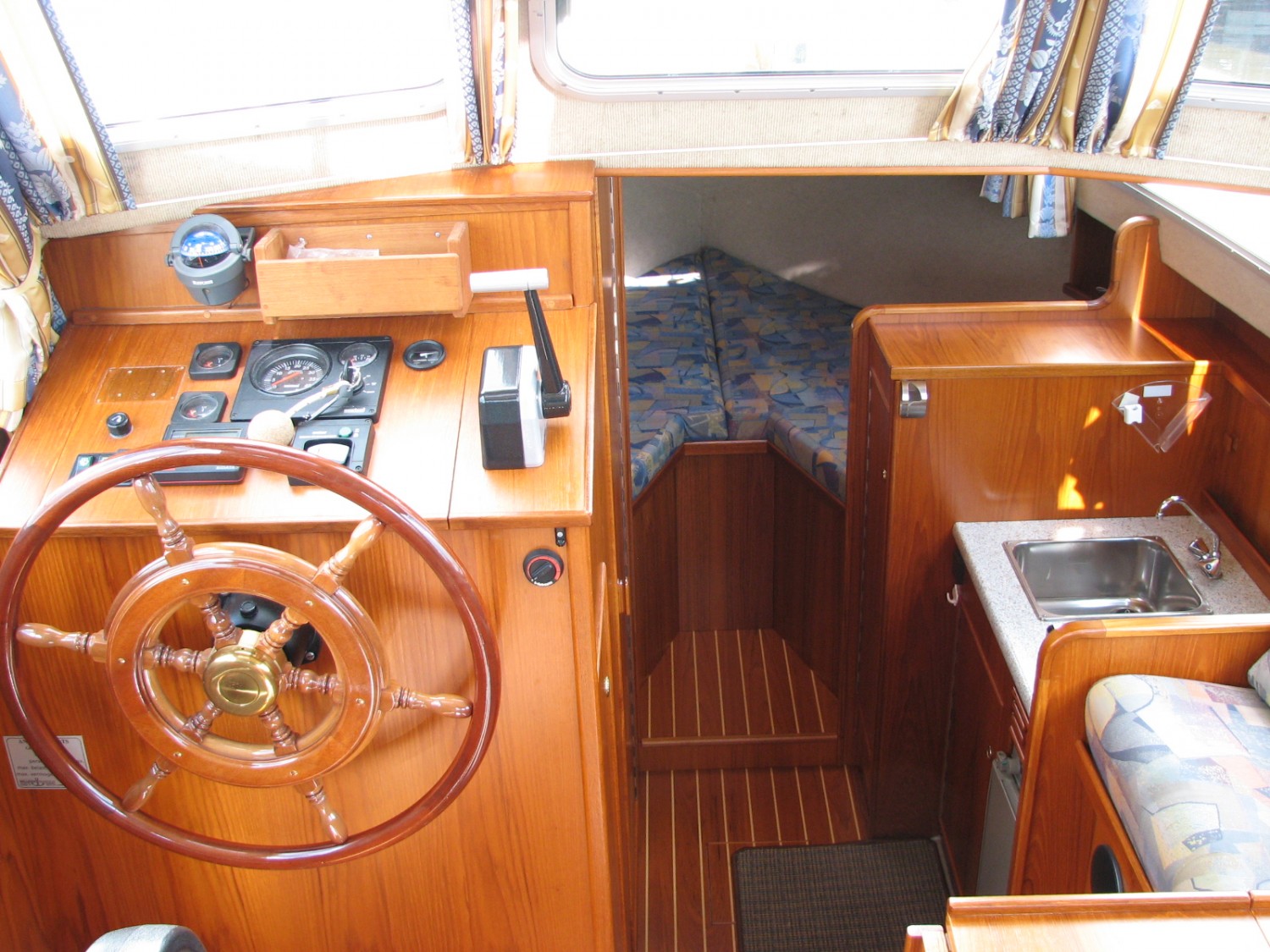 Volledige betimmering in teak of mahonie en teakline vloer met zwarte bies in de kuip en cabin